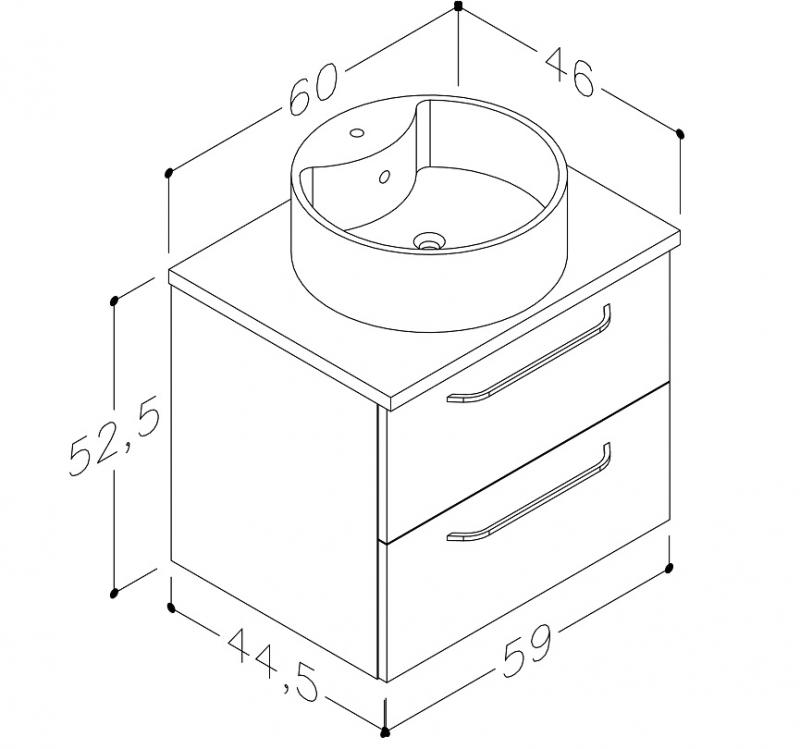 Apatinė spintelė su juodo ąžuolo stalviršiu ir apvaliu paustuvu, 2 stalčiai, blizgiai baltaFasadai pagaminti iš MDF.Metalinės, blizgios rankenėlės.Plotis 60; 75; 90; 120 cmAukštis 52,5 cmIlgis 46 cm