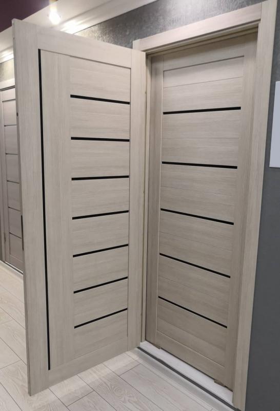 Durų varčia pilnavidurė. Durų varčios karkasas sutvirtintas iš daugiasluoksnės faneros plokščių ir klijuotos pušies masyvo. Varčioje yra išfrezuota vieta spynai. Stiklas - juodas, nepermatomas.