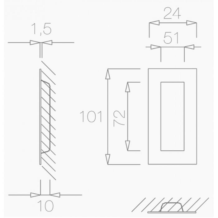 Stumdomų durų rankena skirta vidaus patalpų min 30mm storio durims. Rankenos frezuojamos į durų varčią. Matmenys 101x51mm