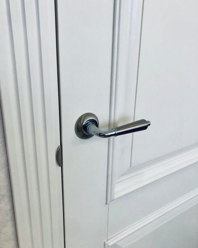 STANDARTINIAME DURŲ KOMPLEKTE: Varčia, reguliuojama stakta su sandarinimo tarpine, tylaus uždarymo spyna su plokštele, vyriai.