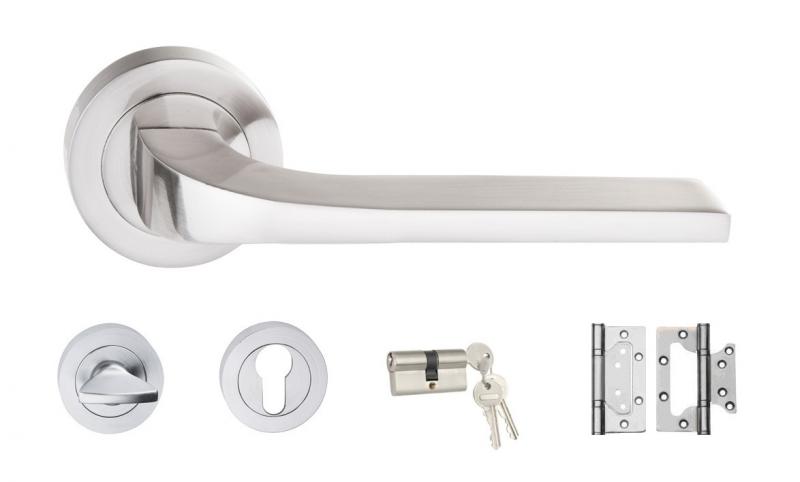 STANDARTINIAME DURŲ KOMPLEKTE: Varčia, reguliuojama stakta su sandarinimo tarpine, tylaus uždarymo spyna su plokštele, vyriai.