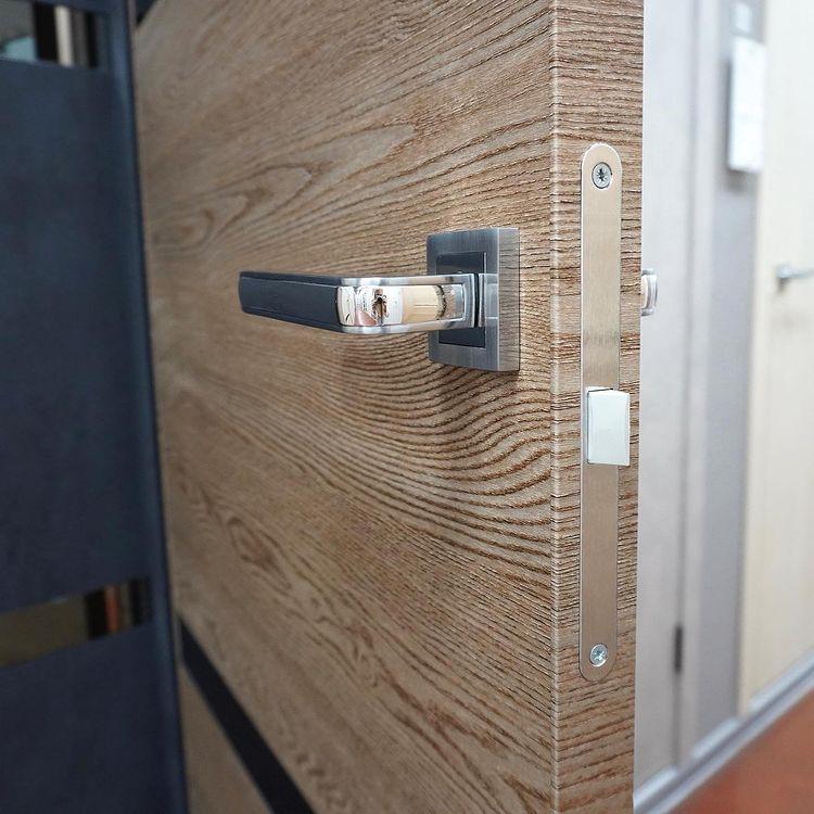 STANDARTINIAME DURŲ KOMPLEKTE: Varčia, reguliuojama stakta su sandarinimo tarpine, tylaus uždarymo spyna su plokštele, vyriai.