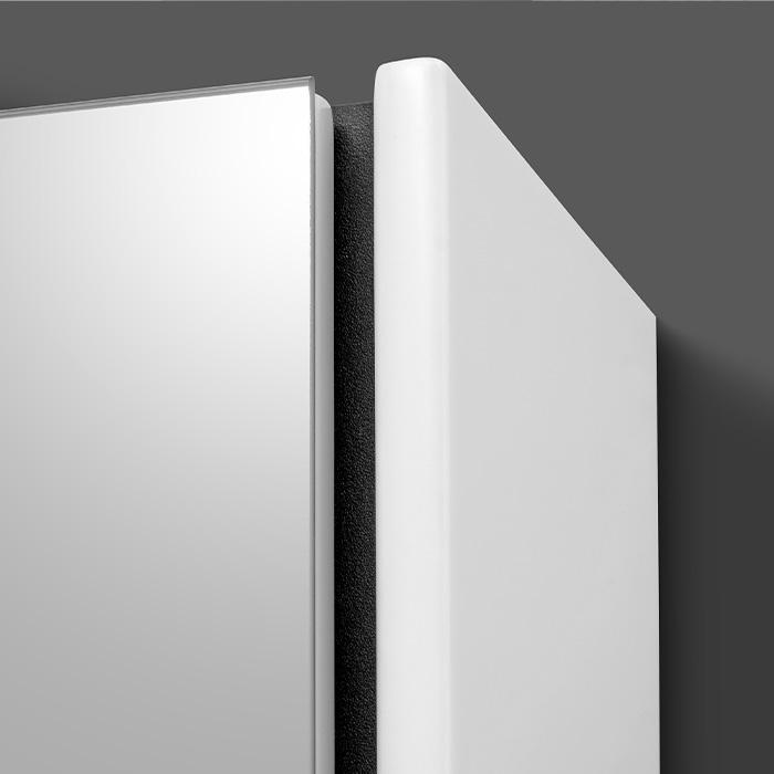 Modernaus dizaino vonios kambario spintelė. Spintelės šonai dekoruoti juoda spalva – taip suteikiant baldui bei jūsų vonios kambariui išskirtinimo. Ši spintelė puikiai dera su apatine spintele SA55-3. Veidrodinėje spintelėje rasite visuomet praverčiančius LED šviestuvėlį, kištukinį lizdą bei reguliuojamo aukščio lentynėles. Spintelėje įmontuoti švelniai užsidarantys lankstai, kurių dėka durelės varstomos itin tyliai ir sklandžiai. Šią baldų furnitūrą ne tik malonu naudoti – ji taip pat pasižymi ilgesniu naudojimo laikotarpiu, lyginant su įprasta furnitūra. Be to, baldo gamybos metu lankstai yra ne įgręžiami, o įpresuojami – tokiu būdu įtvirtinami tiksliai ir patvariai. Tai ypač svarbu, nes vonios baldai yra intensyviai eksploatuojami, todėl privalo būti patvarūs. Vonios spintelė padengta poliuretaniniais dažais, kurių dėka nudažyti paviršiai yra nepriekaištingai lygūs, lengvai valomi, atsparūs drėgmei, o spalva ir blizgesys ilgai išlieka nepakitę. Balta spintelės spalva – tai gaivos ir švaros spalva, puikiai tinkanti vonios kambariui.