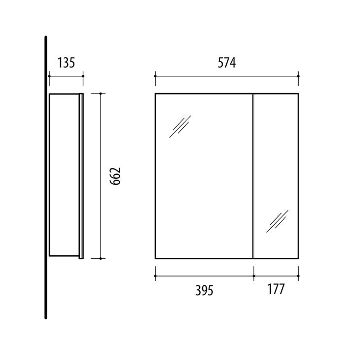 574 x 662 x 135 mm (plotis, aukštis, gylis)