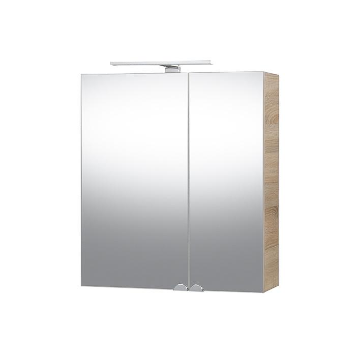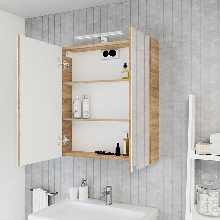 Veidrodinė spintelė pagaminta iš Sonoma Oak rašto laminato, kuris gali padėti susikurti šviesaus ir gaivaus vonios kambario įspūdį.