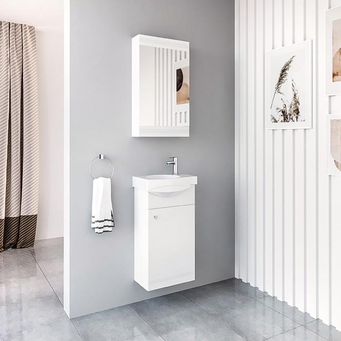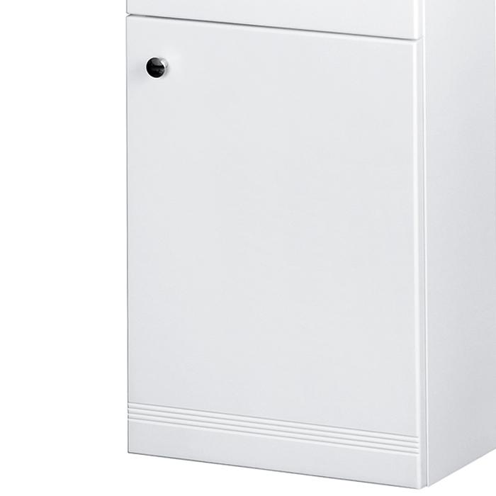 Kompaktiška, estetiška ir funkcionali – taip galima apibūdinti šią vonios kambario spintelę. Tobulai subalansuotas dydis suteikia galimybę ją pakabinti net ir pačioje mažiausioje erdvėje, o neutrali balta spalva ir minimalistinės formos leidžia spintelę pritaikyti įvairaus stiliaus interjere. Spintelėje įmontuoti tyliai-švelniai užsidarantys lankstai, pasižymintys ilgaamžiškumu. Be to, baldo gamybos metu lankstai yra ne įgręžiami, o įpresuojami. Šios technologijos dėka lankstai įtvirtinami tiksliai ir patvariai. Tai ypač svarbu, nes vonios baldai yra intensyviai eksploatuojami, todėl privalo būti patvarūs. Spintelė padengta poliuretaniniais dažais, kurių dėka nudažyti paviršiai yra nepriekaištingai lygūs, lengvai valomi, atsparūs drėgmei, o spalva ir blizgesys ilgai išlieka nepakitę. Balta spintelės spalva – tai gaivos ir švaros spalva, puikiai tinkanti vonios kambariui.