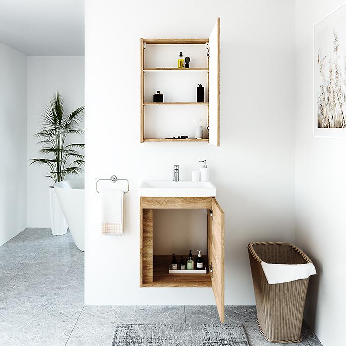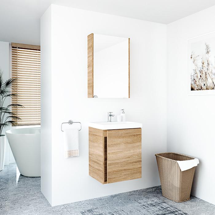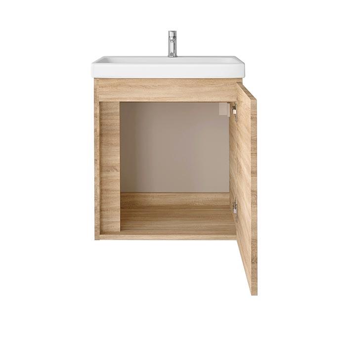 Kompaktiška, estetiška ir funkcionali – taip galima apibūdinti šią minimalistinio dizaino vonios kambario spintelę. Tobulai subalansuotas dydis suteikia galimybę ją pakabinti net ir pačioje mažiausioje erdvėje, o pakabinamos konstrukcijos dizainas gali sumaniai pasitarnauti išnaudojant kiekvieną jūsų vonios kambario centimetrą. Minimalistinės šios spintelės formos leidžia spintelę pritaikyti įvairaus stiliaus interjere. Spintelėje įmontuoti švelniai užsidarantys lankstai, kurių dėka durelės varstomos itin tyliai ir sklandžiai. Šią baldų furnitūrą ne tik malonu naudoti – ji taip pat pasižymi ilgesniu naudojimo laikotarpiu, lyginant su įprasta furnitūra. Be to, baldo gamybos metu lankstai yra ne įgręžiami, o įpresuojami – tokiu būdu įtvirtinami tiksliai ir patvariai. Tai ypač svarbu, nes vonios baldai yra intensyviai eksploatuojami, todėl privalo būti patvarūs. Baldas pagamintas iš kokybiškų medžiagų, kurios yra lengvai prižiūrimos, pasitelkiant įprastas valymo priemones. Spintelė dekoruota Sonoma Oak rašto laminatu, kuris sukuria gaivų ir šviesų vonios įspūdį.