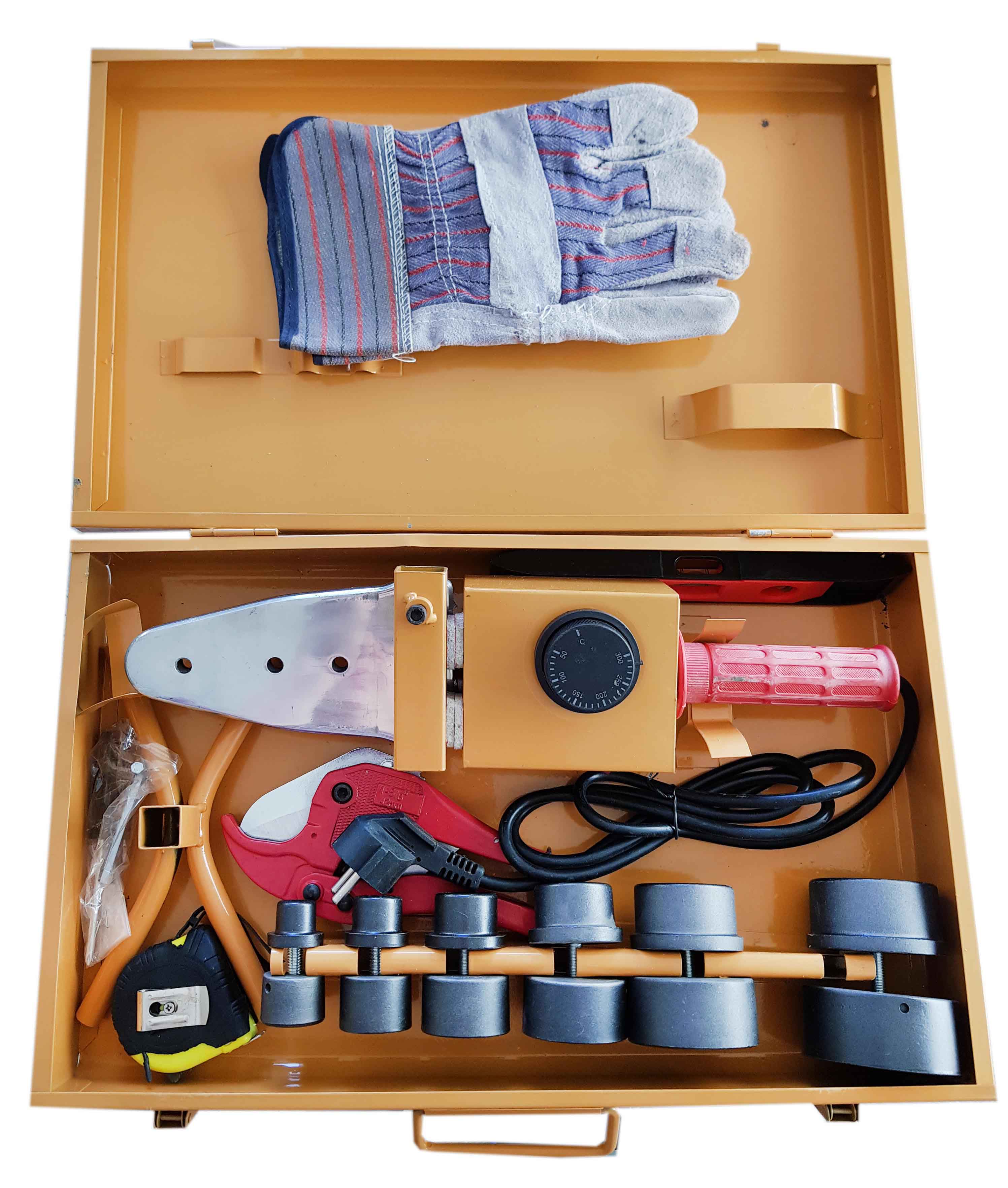 Komplektacija: litavimo aparatas, aparato laikiklis - priveržėjas, litavimo antgaliai 20-63mm, PPR žirklės, matavimo ruletė 3m, šešiakampis raktelis, figūrinis atsuktuvas, pirštinės.