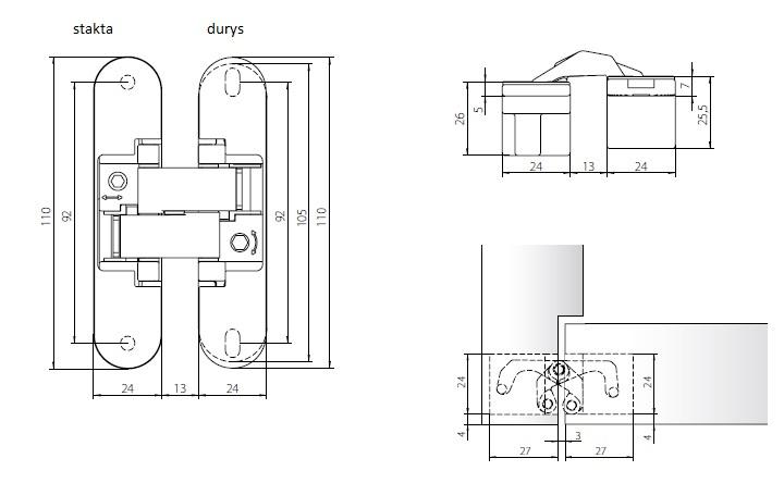 Reguliavimas: vertikaliai +/- 2,5mm; horizontaliai +/-1,5mm; į gylį +/-1mm.