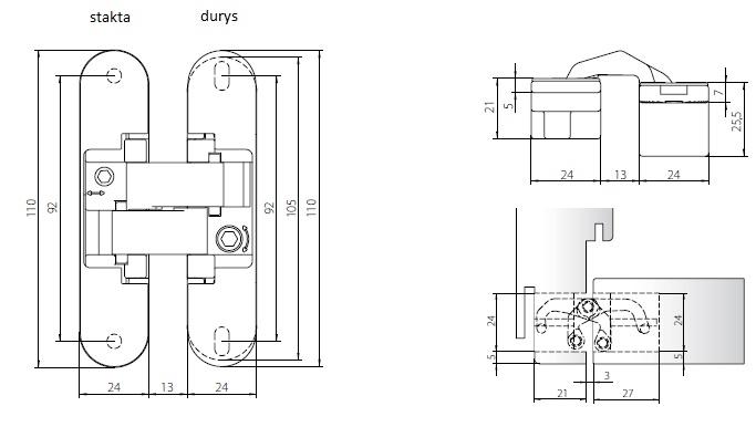 Reguliavimas: vertikaliai +/-2,5mm; horizontaliai +/-1,5mm; į gylį +/-1mm.