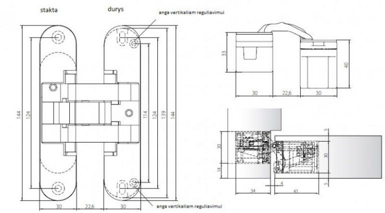 Reguliavimas: vertikaliai +/-2,5mm; horizontaliai +/-1mm; į gylį +/-1mm.