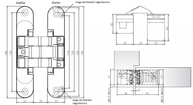 Reguliavimas: vertikaliai +/-2,5; horizontaliai +/-1mm; į gylį +/-1mm.