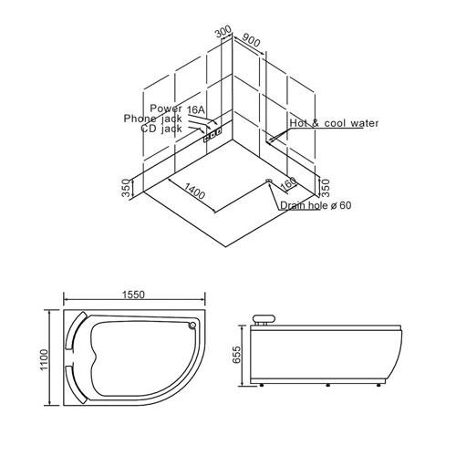 Vonioje yra 15 masažinių vandens purkštukų, išdėstytų vonios šonuose.