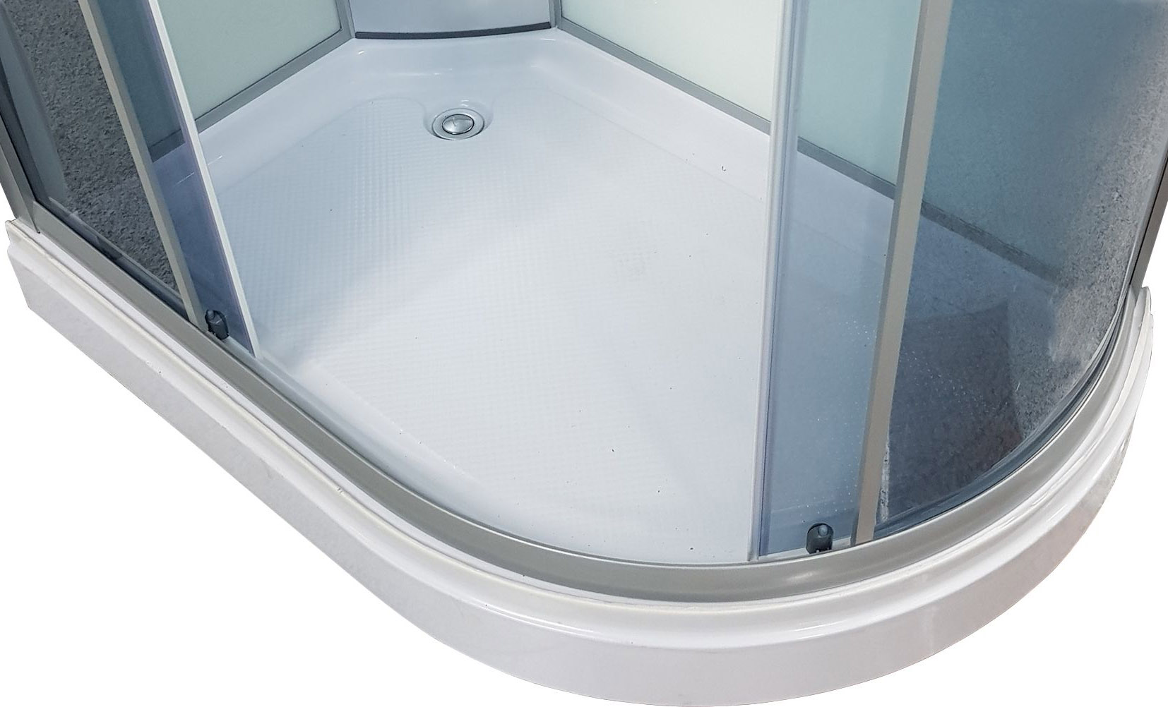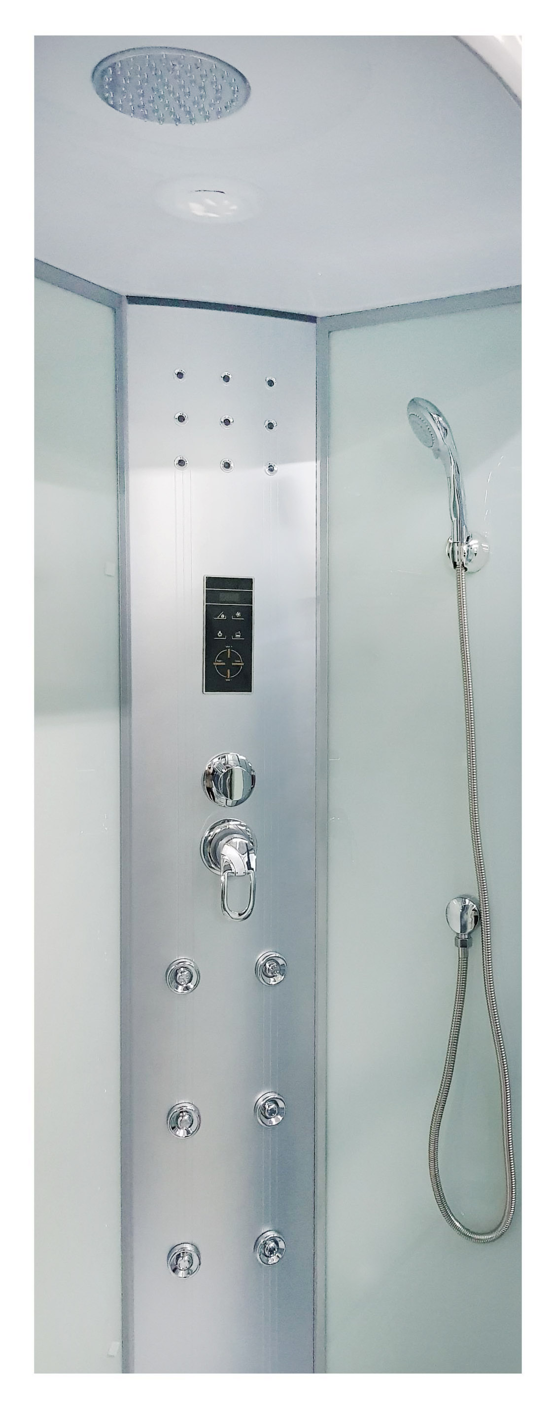 Dušo kabina statoma į kairįjį patalpos kampą.