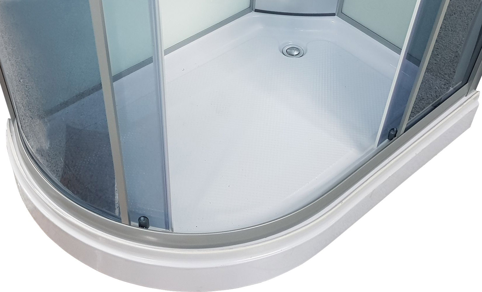 Dušo kabina statoma į dešinįjį patalpos kampą.
