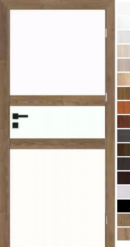 Durų varčios rėmas pagamintas iš spygliuočių medienos. Užpildas - vamzdinė medžio drožlių plokštė. Varčia baltos matinės spalvos, pasirenkant centrinės juostos dekorą. Varčios kraštas yra tokios pat spalvos kaip ir vidinės apdailos.