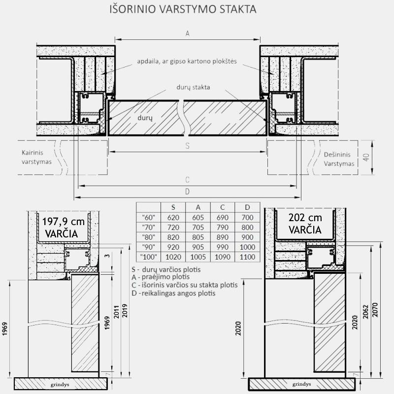 Praėjimo plotis: 60,5 cm; 70,5 cm; 80,5 cm; 90,5 cm; 100,5 cm.