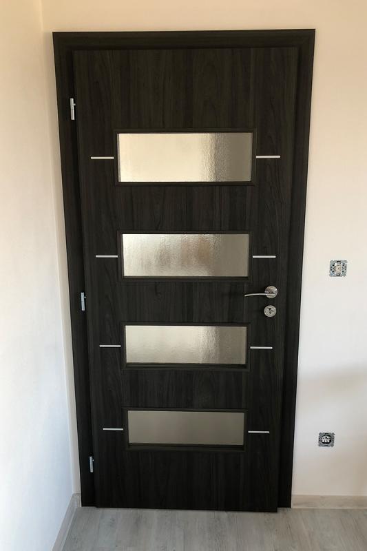 Durų varčios rėmas pagamintas iš spygliuočių medienos, užpildytas medžio drožlių plokšte. Rėmas su užpildu iš abiejų pusių padengtas HDF plokšte. Aliuminio intarpai 8×2 mm. Stiklas 4mm storio, matinis.