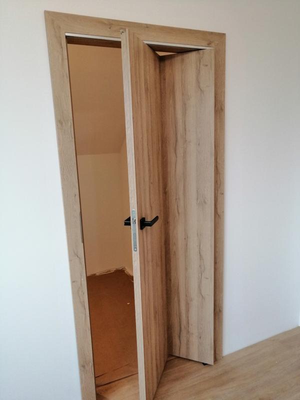 Dviejų elementų durų varčia sujungta viena su kita 3 įleidžiamaisiais vyriais, reguliuojama durų stakta sulankstomosioms durims, spyna.