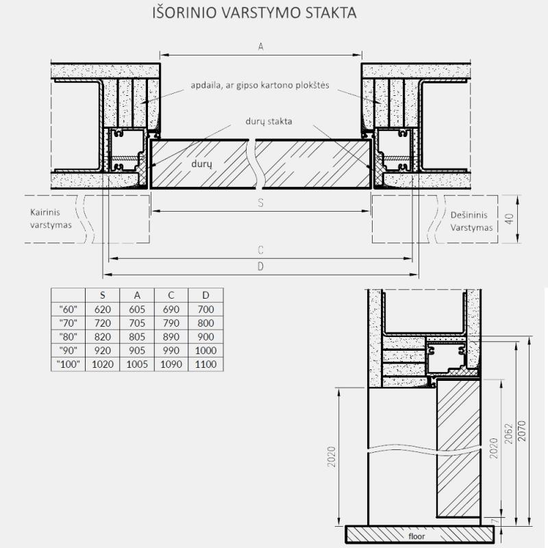 Praėjimo plotis: 60,5 cm; 70,5 cm; 80,5 cm; 90,5 cm; 100,5 cm.