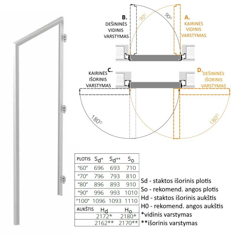 Durų varčios rėmas pagamintas iš spygliuočių medienos, užpildas "korys", išorė HDF plokštė. Su kištukiniais lizdais paslėpties vyriams.