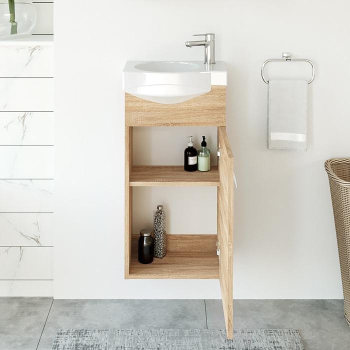 Sonoma Oak rašto dekoras gali padėti susikurti gaivaus ir šviesaus vonios kambario įspūdį.