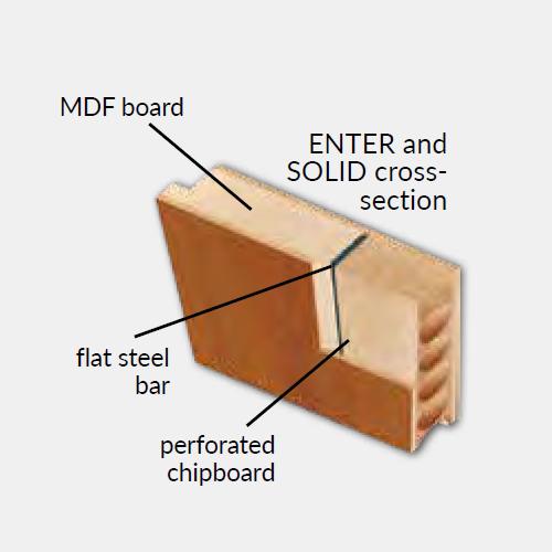 Durų varčios rėmas pagamintas iš MDF, papildomai sustiprintas dviem plieno lakštais. Išorinė HDF plokštė padengta laminatu.