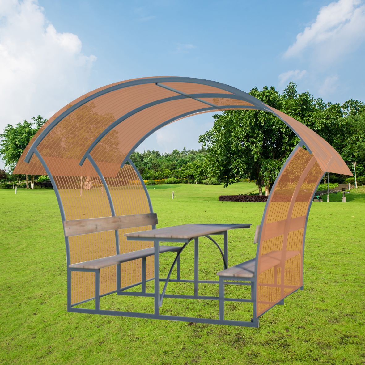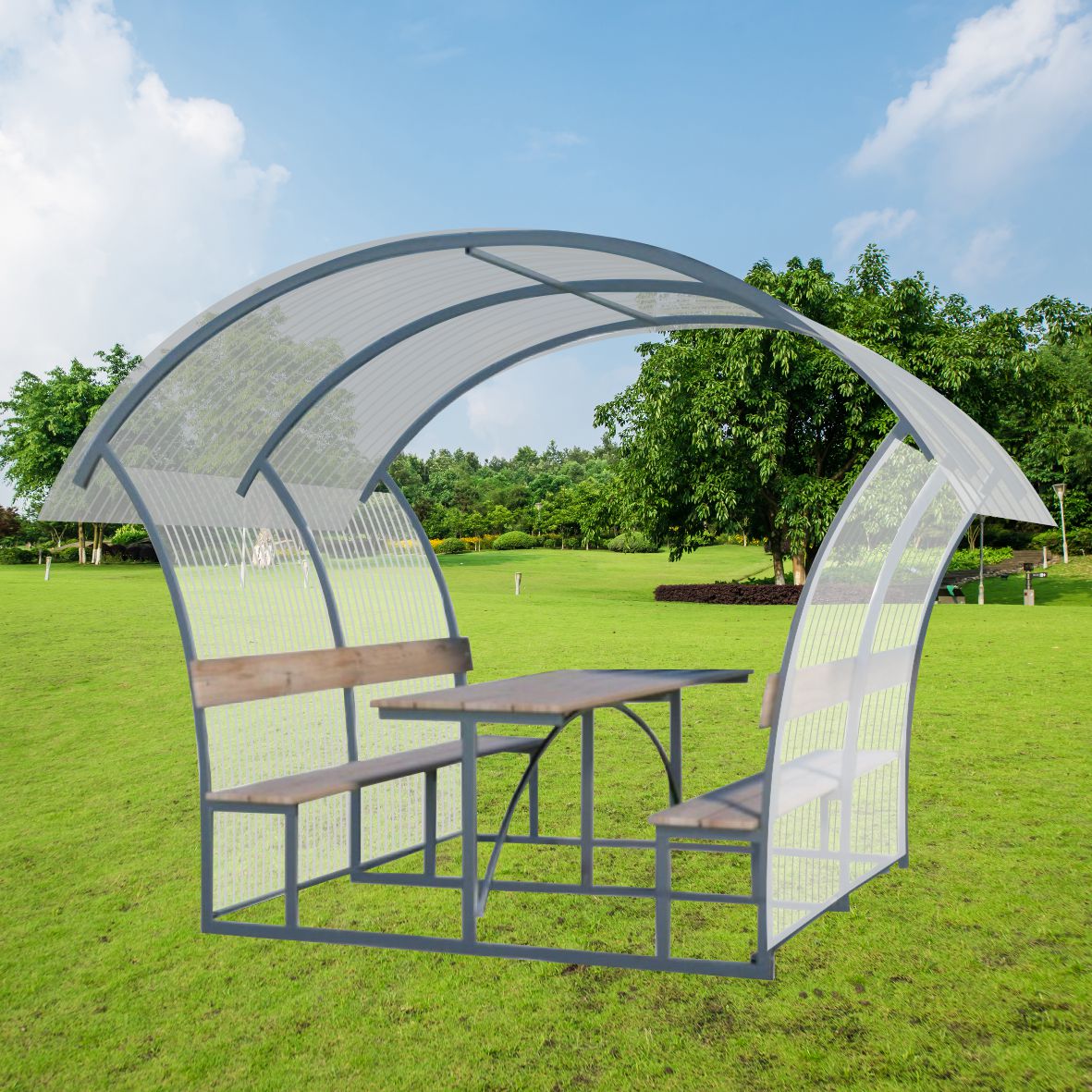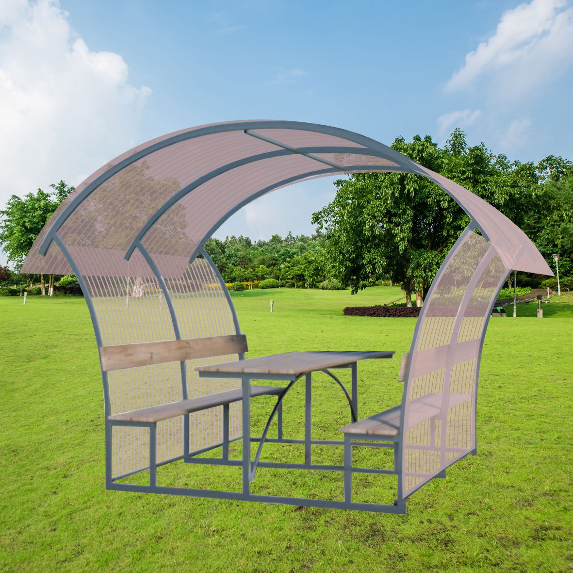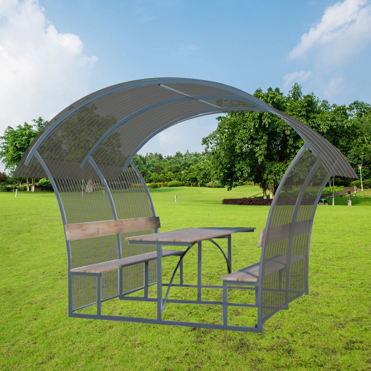 Pavėsinė padengiama polikarbonatine danga.