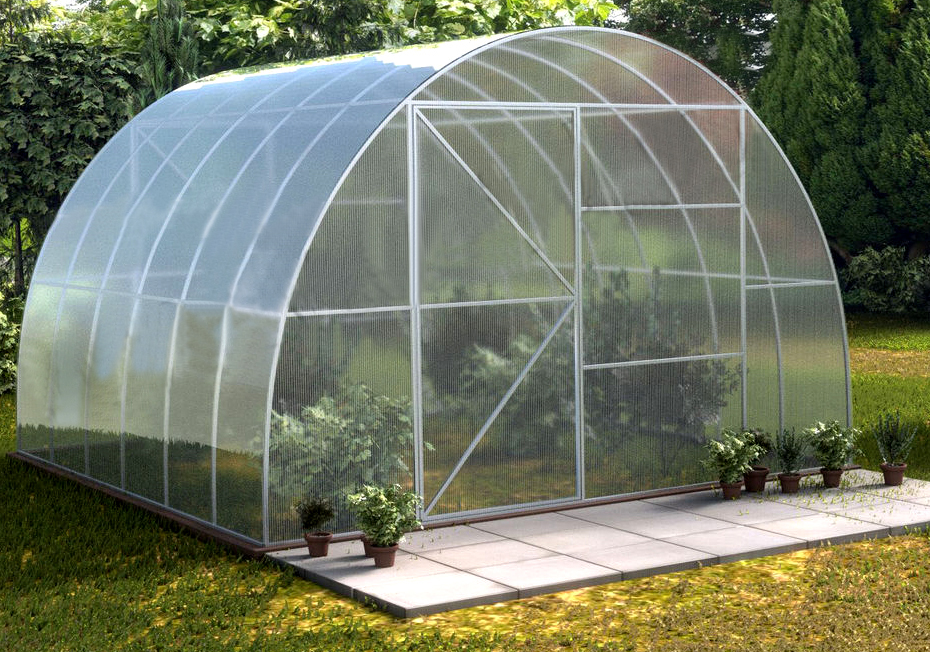 Šiltnamio matmenys: plotis 4 m, ilgis 4 m, aukštis 2.30 m.