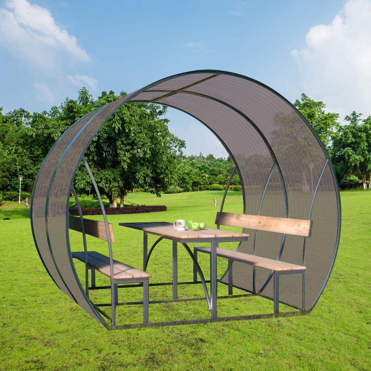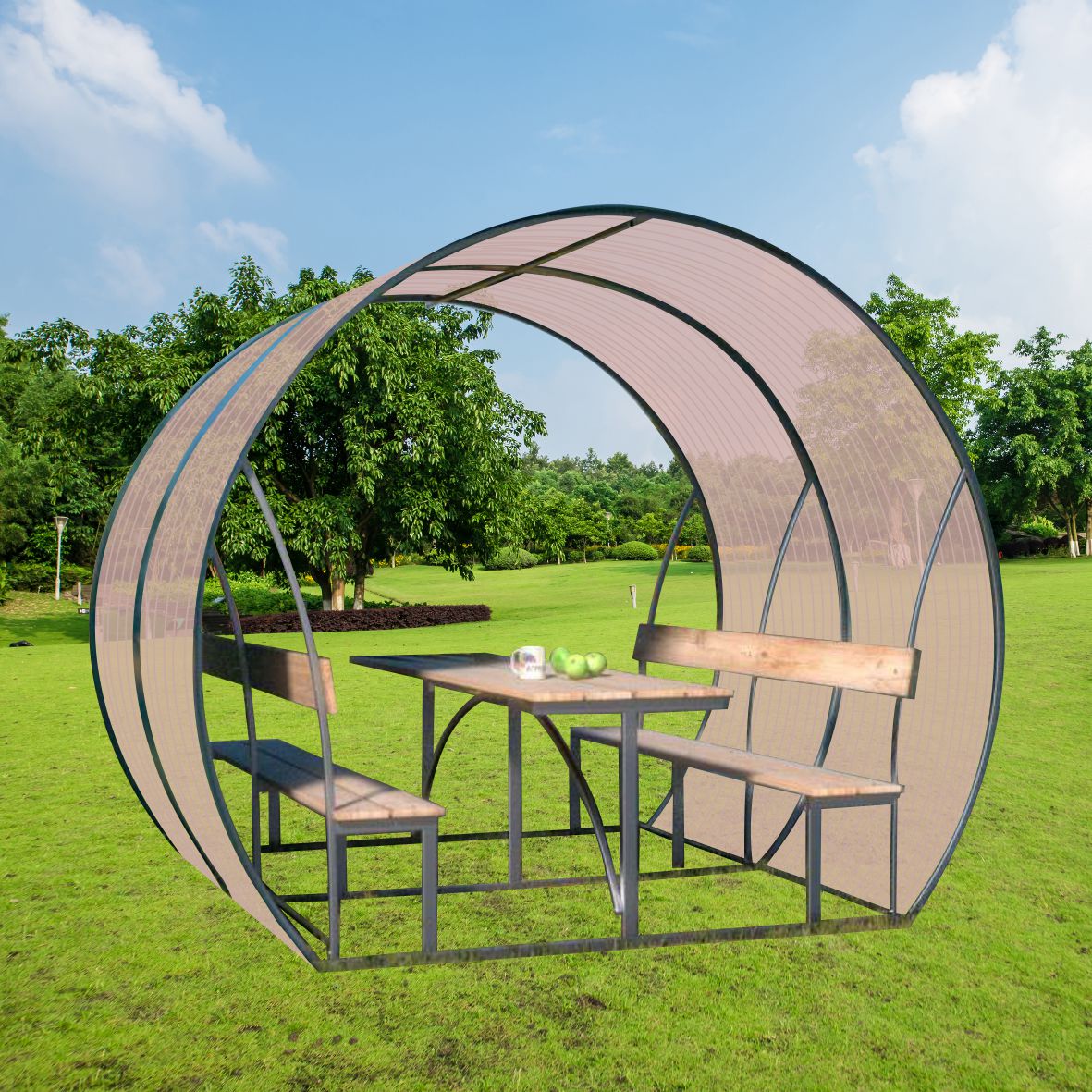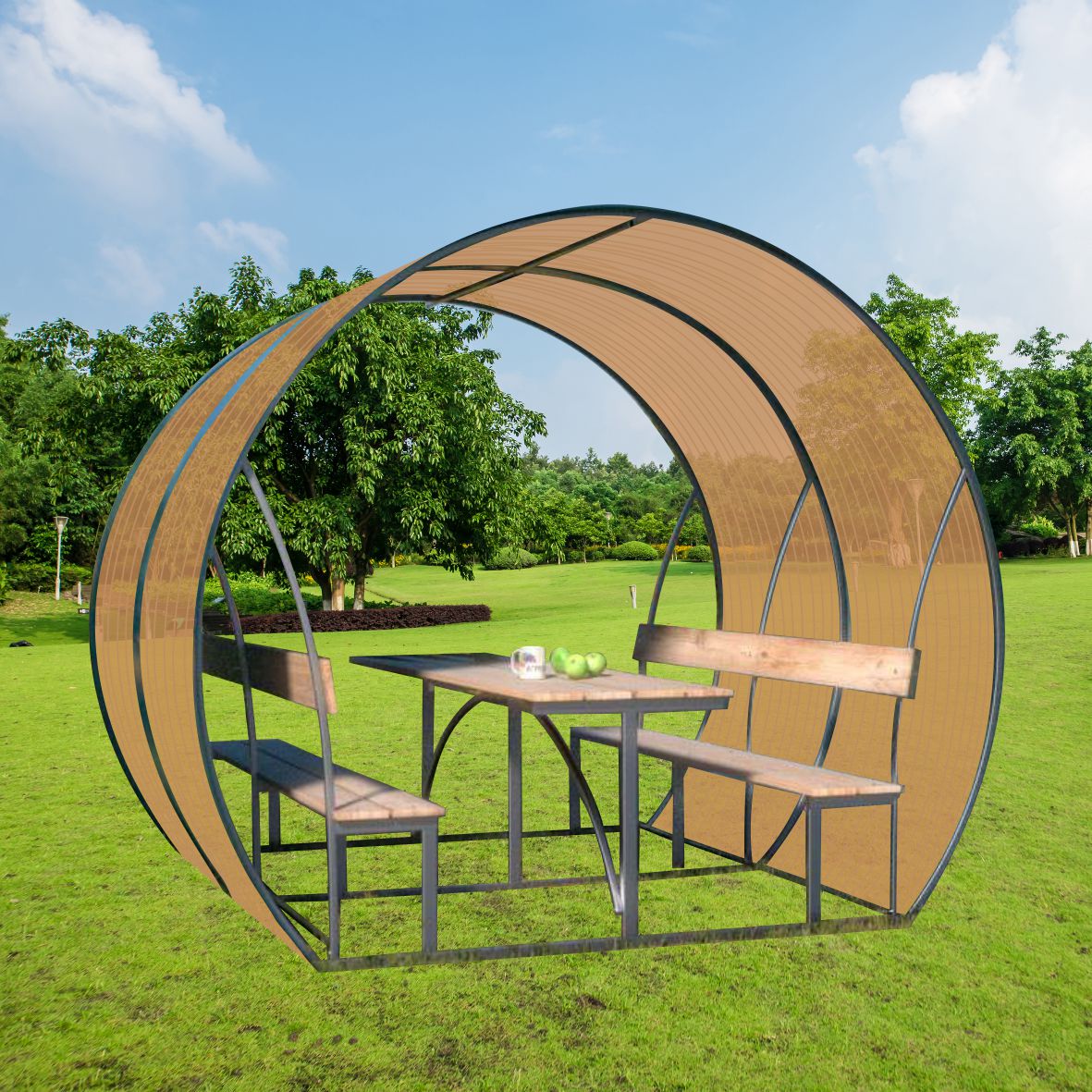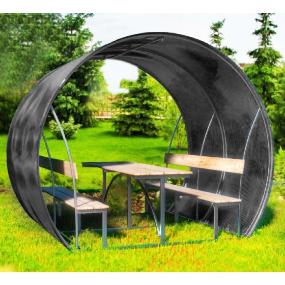 Pavėsinė padengiama polikarbonatine danga.