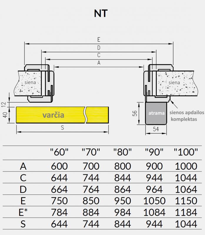 NT - sistema sumontuota naudojant reguliuojamą sienos apdailos komplektą su apvadais.