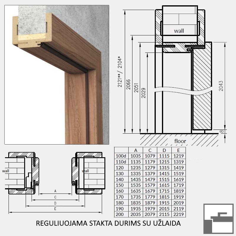 Reguliuojama stakta komplektuojama su abiejų pusių apvadais, pasirenkamas staktos plotis pagal sienos storį, gali būti naudojama sienoms, kurių storis 75-320 mm.