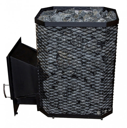 Malkinė pirties krosnelė su kvadrato formos tinkliniu korpusu akmenims.