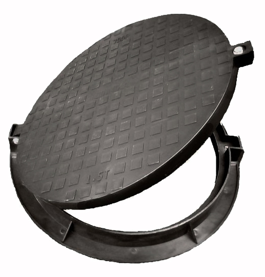Kanalizacijos dangtis. Pagamintas iš plastiko, apvalus.