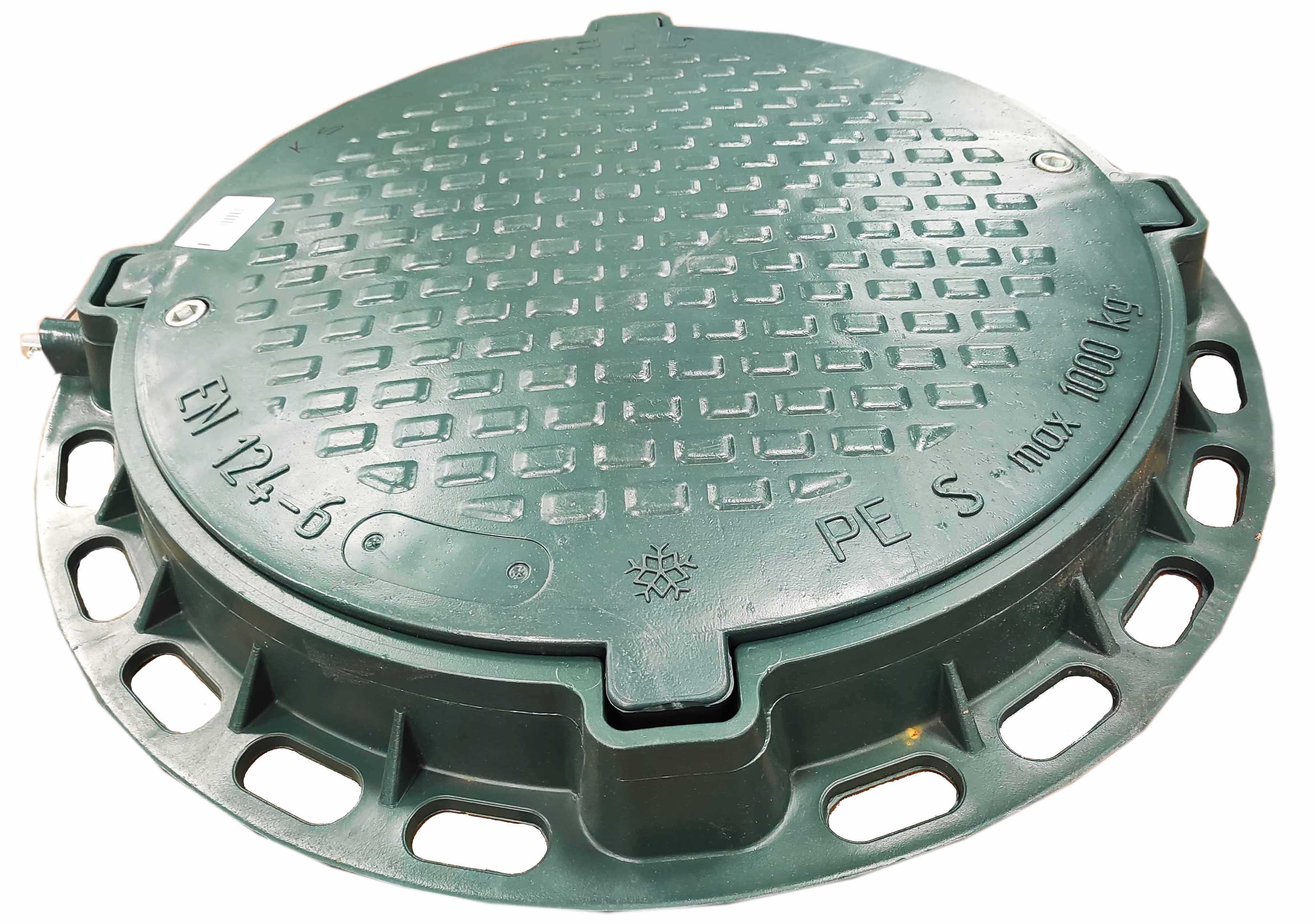 Kanalizacijos dangtis. Pagamintas iš plastiko, apvalus.