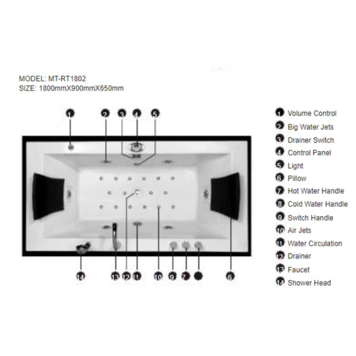 Sūkurinė vonia: dideli purkštukai su reguliuojama kryptimi ir intensyvumu atlieka tikslinį ir efektyvų masažą, o akupunktūros purkštukai sukuria labai koncentruotą masažo patirtį. Paprastai naudojamas ant nugaros ir viršutinės kūno dalies.