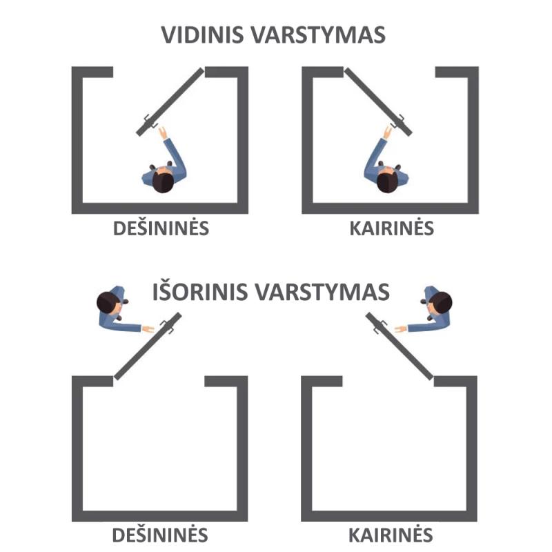 VARSTYMO KRYPTIS: Pasirenkama "kairiniam", arba "dešininiam" varstymui.