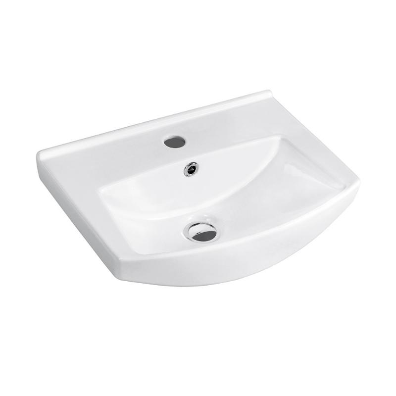 Kompaktiškos formos keraminis praustuvas su persipylimo kanalėliu ir pakelta briauna prie sienos