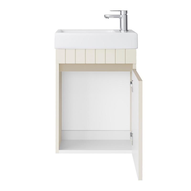 Baldinis keraminis praustuvas gali būti tvirtinamas ant spintelės dvejomis padėtimis (galite pasirinkti vandens maišytuvo vietą: praustuvo kairėje ar dešinėje pusėje).