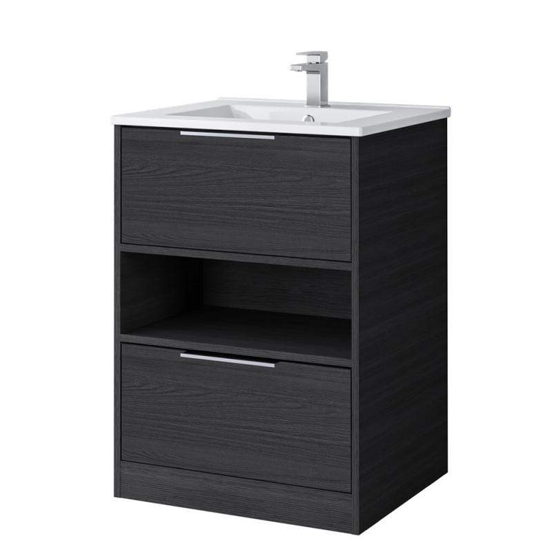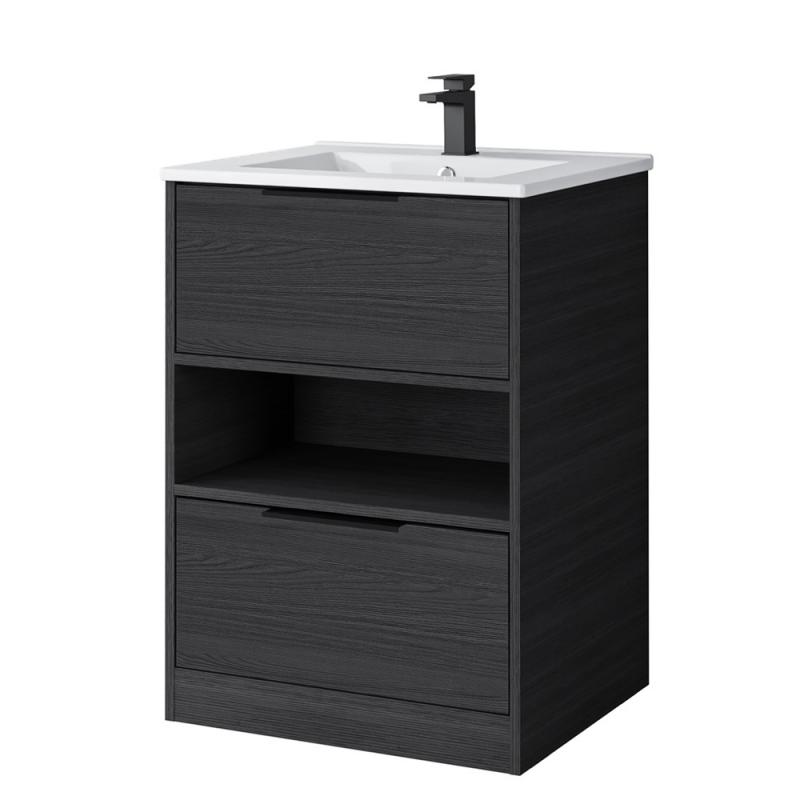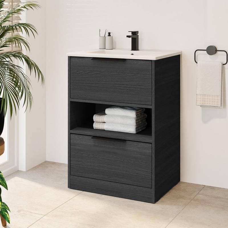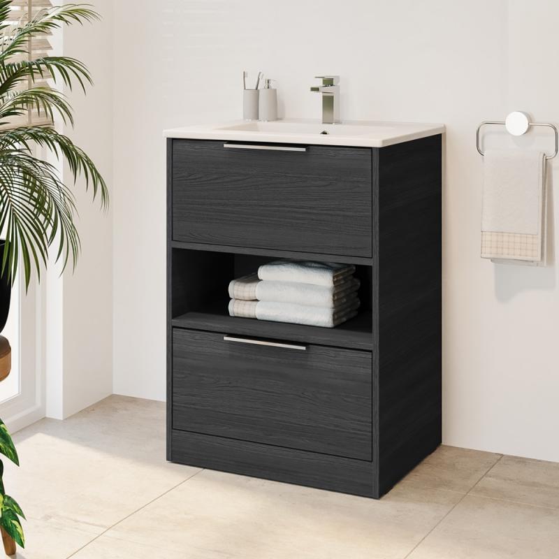 Pastatoma vonios spintelė su dviem stalčiais ir atvira niša. Spintelė parduodama kartu su praustuvu. Sifonas ir vandens maišytuvas į komplektaciją neįeina.
