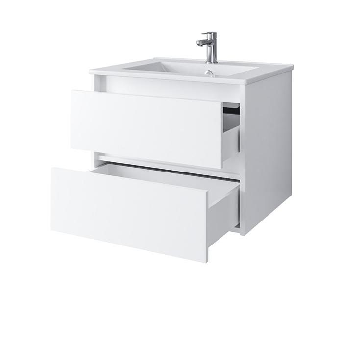 Pakabinama vonios spintelė su dviem tyliai-švelniai užsidarančiais stalčiais. Spintelė parduodama kartu su praustuvu. Sifonas ir vandens maišytuvas į komplektaciją neįeina.