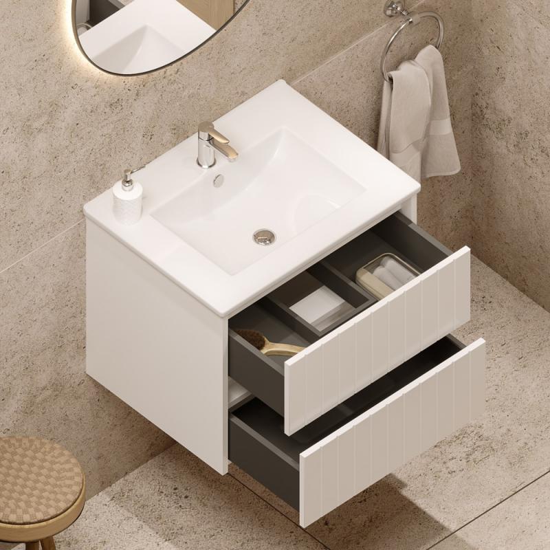 Spintelėje įmontuoti du stalčiai su švelnaus uždarymo bėgeliais. Šią baldų furnitūrą ne tik malonu naudoti – ji taip pat pasižymi ilgesniu naudojimo laikotarpiu, lyginant su įprasta furnitūra. Tai ypač svarbu, nes vonios spintelė yra intensyviai eksploatuojama, todėl privalo būti patvari.