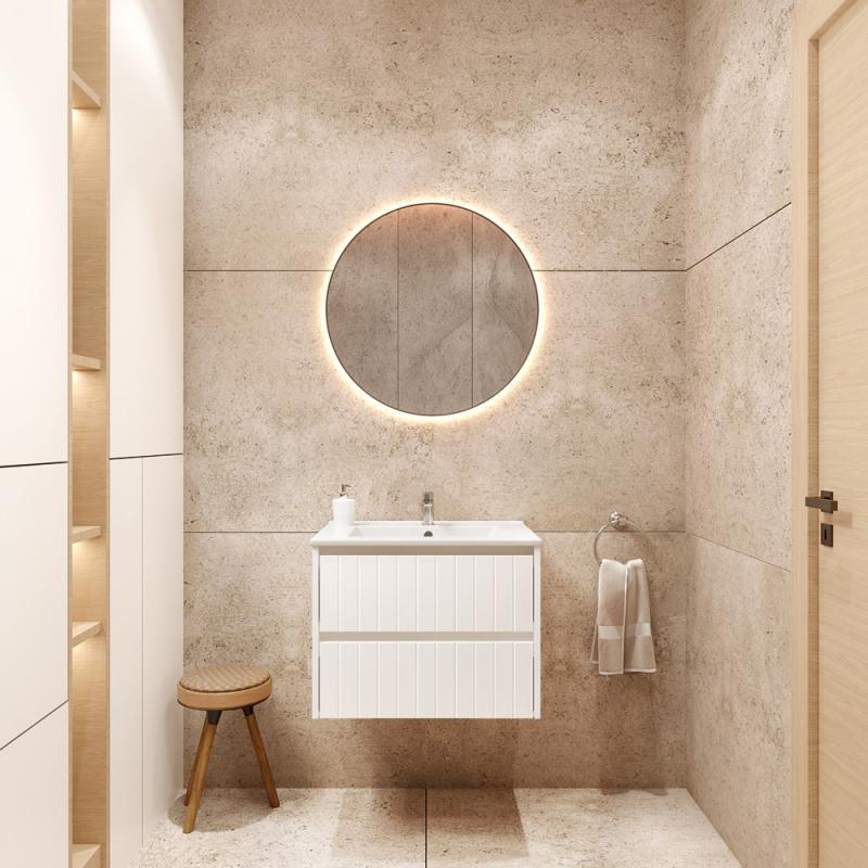 Šiuolaikiško dizaino vonios spintelė. Neapkrautas rankenėlėmis, dailiai išfrezuotas fasadas kuria išskirtinio vonios kambario įspūdį. Minimalistinės spintelės formos leidžia spintelę pritaikyti įvairaus stiliaus interjere.