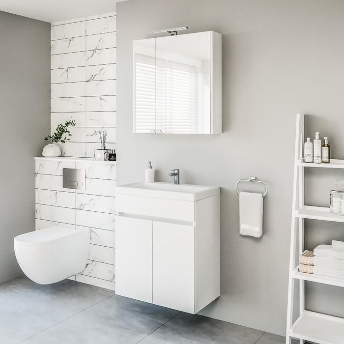 Pakabinama vonios spintelė su dviem durelėm. Spintelė parduodama kartu su praustuvu. Sifonas ir vandens maišytuvas į komplektaciją neįeina.