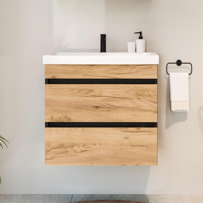 Vonios spintelė nepriekaištingai dera su veidrodine spintele SV60C-2 Black / Gold Craft Oak.