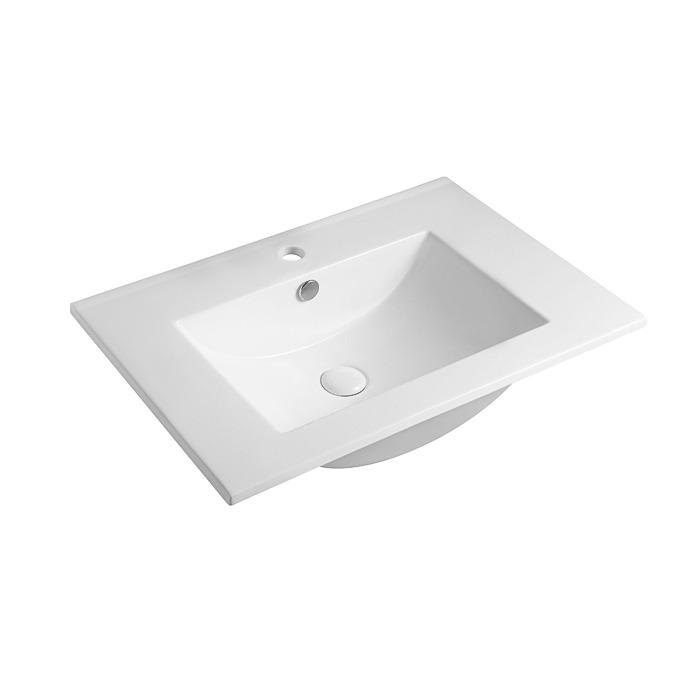 Šiuolaikiškos formos keraminis praustuvas su persipylimo kanalėliu ir paaukštinta briauna prie sienos