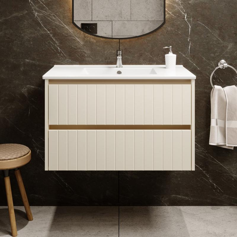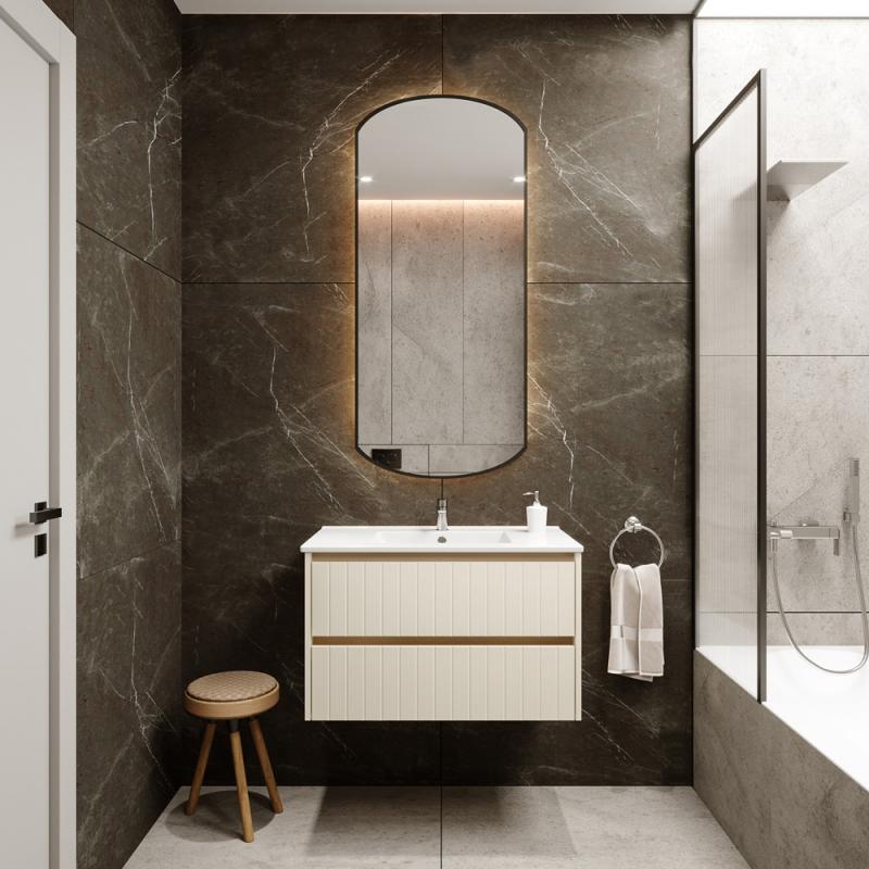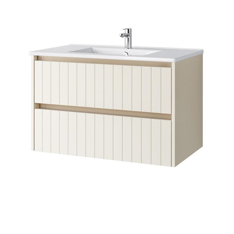 Išskirtinio dizaino vonios kambario spintelė. Neapkrautas rankenėlėmis, dailiai išfrezuotas fasadas kuria stilingo vonios kambario įspūdį. Minimalistinės spintelės formos bei spalvos pasirinkimas leidžia spintelę pritaikyti įvairaus stiliaus interjere.