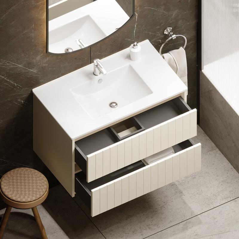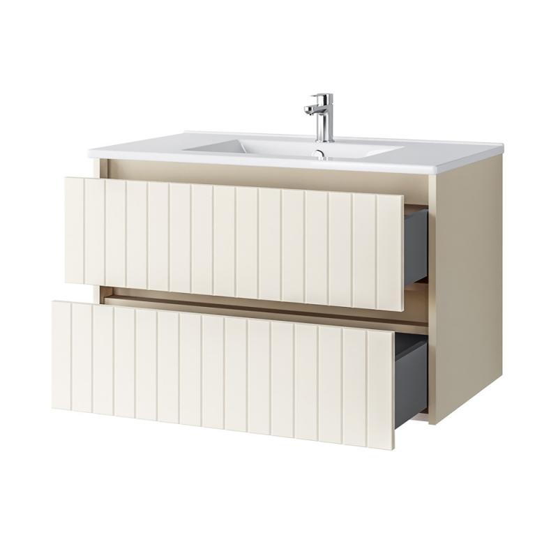 Spintelėje įmontuoti du stalčiai su švelnaus uždarymo bėgeliais. Šią baldų furnitūrą ne tik malonu naudoti – ji taip pat pasižymi ilgesniu naudojimo laikotarpiu, lyginant su įprasta furnitūra. Tai ypač svarbu, nes vonios baldai yra intensyviai eksploatuojami, todėl privalo būti patvarūs.