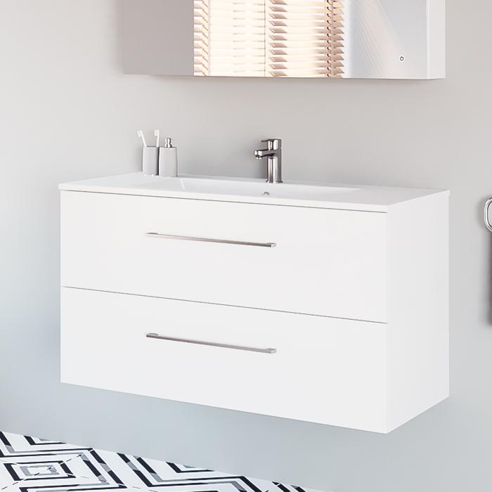 Pakabinama vonios spintelė su dviem stalčiais. Spintelė parduodama kartu su praustuvu. Sifonas ir vandens maišytuvas į komplektaciją neįeina.