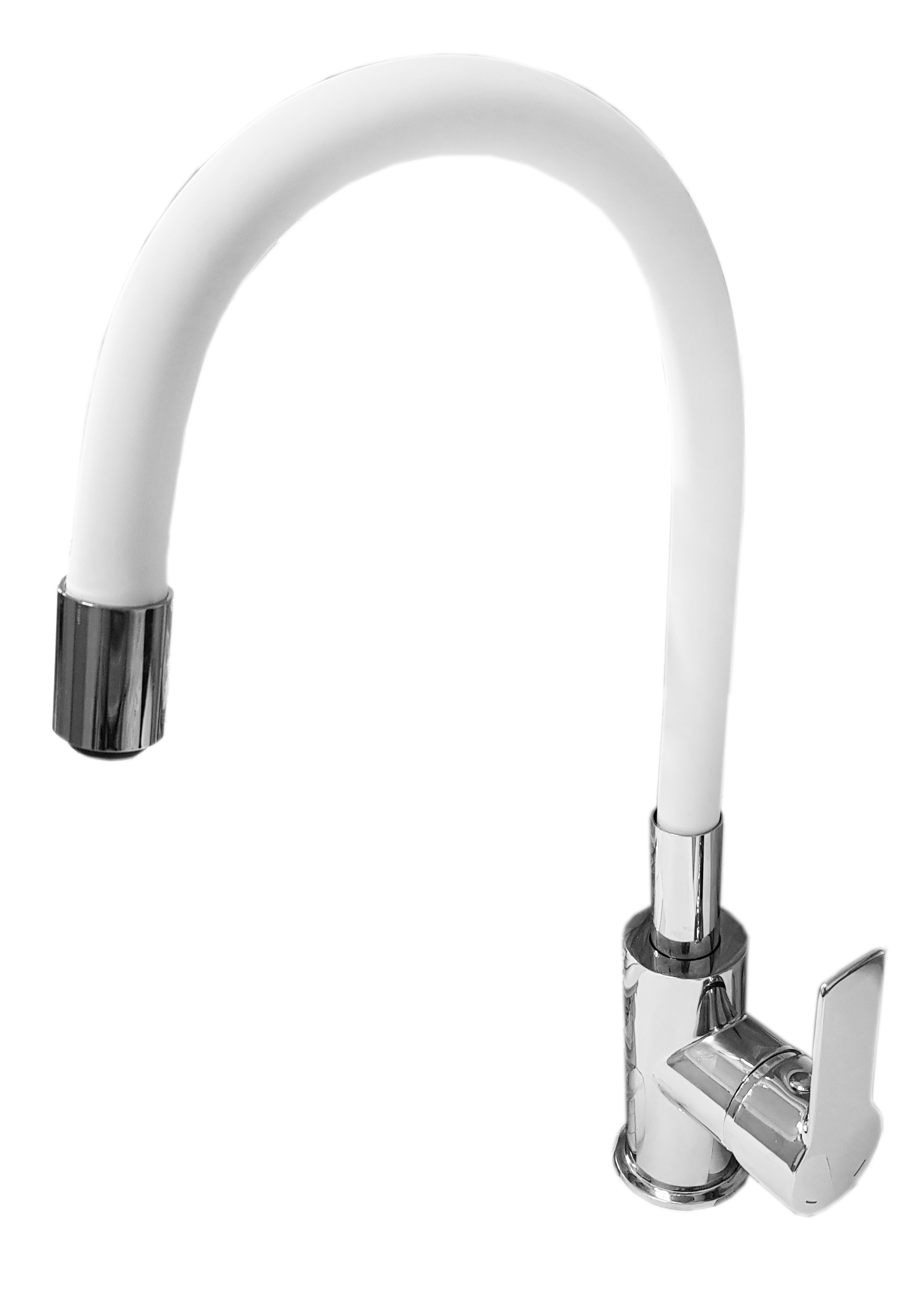 Maišytuvas su lanksčiu silikoniniu baltos spalvos snapu.